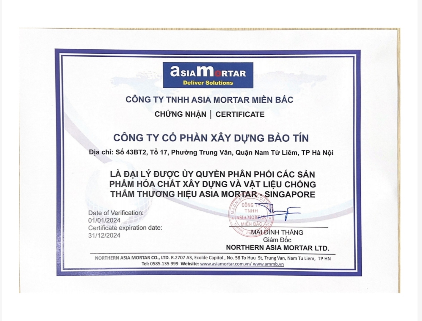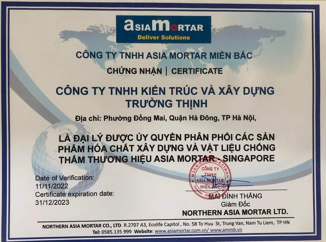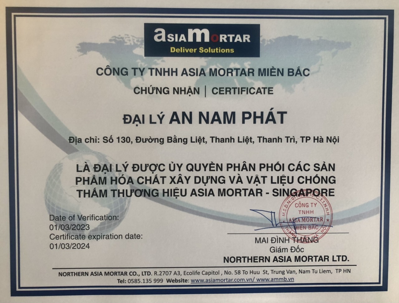 Là đại lý được ủy quyền phân phối các sản phẩm hóa chất xây dựng và vật liệu chống thấm thương hiệu ASIA MORTAR-SINGAPORE